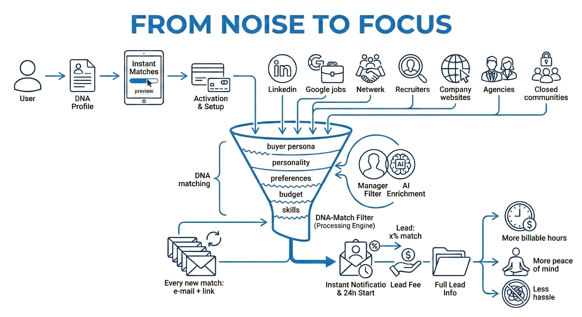 Geen tijd meer verliezen aan handmatig zoeken naar klanten die niet klaar zijn om te kopen. James AI monitort 10+ bronnen voor jou en stuurt gekwalificeerde leads die perfect passen bij jouw expertise direct naar je mailbox. Warme koopklare prospecten. Geen gedoe — gewoon concrete projecten binnen 2 weken.